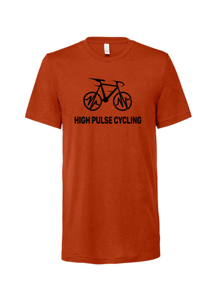 Show your High Pulse passion on the road or around town with the High Pulse Cycling shirt. This tri-blend, lightweight, breathable shirt is perfect for wearing while you are doing a High Pulse Cycling workout.  Sizes are unisex.