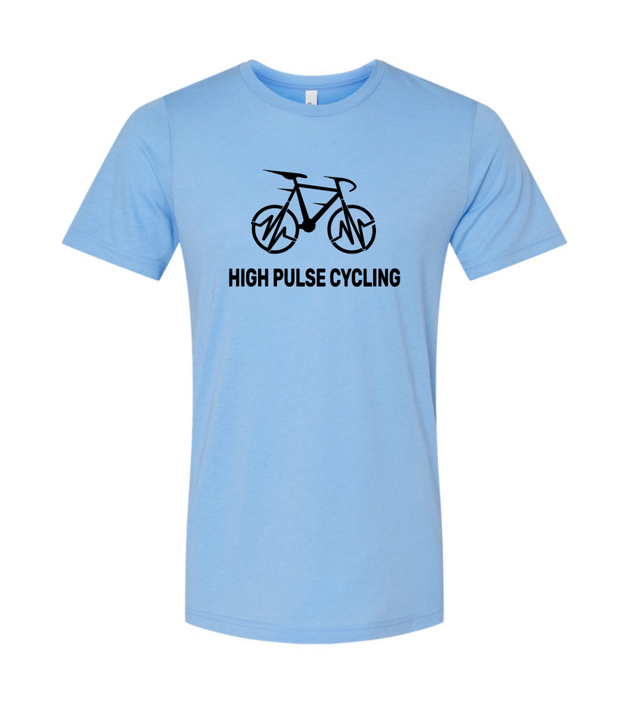 Show your High Pulse passion on the road or around town with the High Pulse Cycling shirt. This tri-blend, lightweight, breathable shirt is perfect for wearing while you are doing a High Pulse Cycling workout. Sizes are unisex.