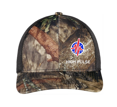 Show your High Pulse pride in the woods with the High Pulse Mossy Oak Camo Snapback Trucker Hat.  This hat is 87/13 poly/spandex on the front panels and 100% polyester mesh back providing a moisture wickering material to stay comfortable during your hunt.